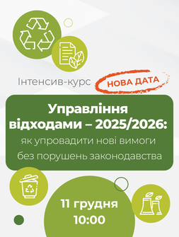 Управління відходами – 2025/2026: як упровадити нові вимоги без порушень законодавства (інтенсив-курс підвищення кваліфікації для інженерів і керівників відділів охорони навколишнього середовища)